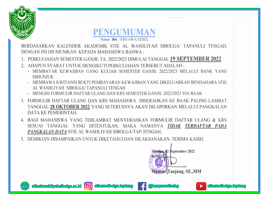 PENGUMUMAN PELAKSANAAN PERKULIAHAN SEMESTER GANJIL TA. 2022/2023